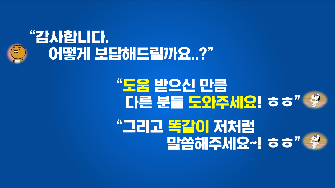 성공하신 분들이 저에게 묻습니다. "어떻게 보답해드리면 될까요?" 그러면 저는 "도움받으신 만큼 다른 분들을 도와주세요."라고 말씀드립니다.