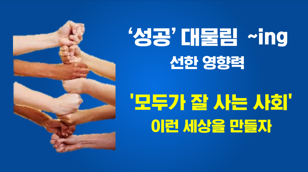 저는 [성공 대물림] 선한 영향력을 믿습니다. 저의 성공 사례를 공유하여 다른 사람이 성공하고... 또 그분이 성공사례를 공유하여 다른 사람이 성공하는...