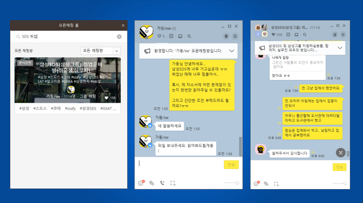 너무 힘들어하던 당시 저와 같은 마음을 가진 사람들이 있을까 하여 오픈 채팅방에 'SDS 취업'이라고 검색해봤고 저와 같이 취업을 준비하는 분들이 있는 방에 들어가게 되었습니다. 그때 당시 저는 위로를 받을 뿐만 아니라 대화를 나누며 저의 문제점들을 하나씩 찾을 수 있었습니다. 저는 많은 분들께 도움을 받으며 다시 일어나 도전을 할 수 있었습니다. 도전을 하며 또 저처럼 처음 단톡방에 들어오신 분들께도 제가 받은 도움을 나눠드리며 다시 공부가 되었습니다.