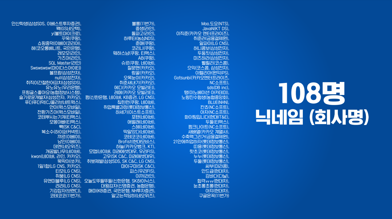 여러분. 혹시 여기 나와있는 108명이 어떤 분들인지 아시나요? 닉네임이 적혀있고 그 옆에는 회사명이 적혀있습니다. 잘 모르시겠죠? 108명이 어떤 의미를 갖고 있는지 제 이야기를 들려드린 뒤 정답을 말씀드리겠습니다. (현재는 수 백명입니다. 21년 2월 경 108명은 발표날 기준입니다.)