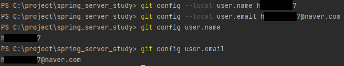 git config --local user.name {input name} 과 git confing --local user.email {input email} 명령어를 통해 정보를 변경합니다.