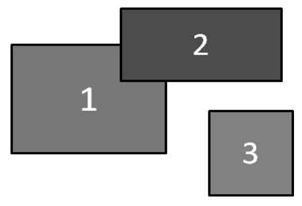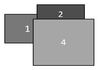 여기에 그림-2에서 보인 것처럼 4번 색종이가 하나 더 놓이면 3번 색종이는 완전히 가려서 보이지 않게 된다. 그리고, 1번 색종이와 2번 색종이는 부분적으로 가려 보이며, 4번 색종이는 완전히 보이게 된다.