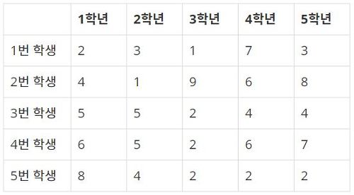 그래서 오민식 선생님은 각 학생들이 1학년부터 5학년까지 몇 반에 속했었는지를 나타내는 표를 만들었다. 예를 들어 학생 수가 5명일 때의 표를 살펴보자.